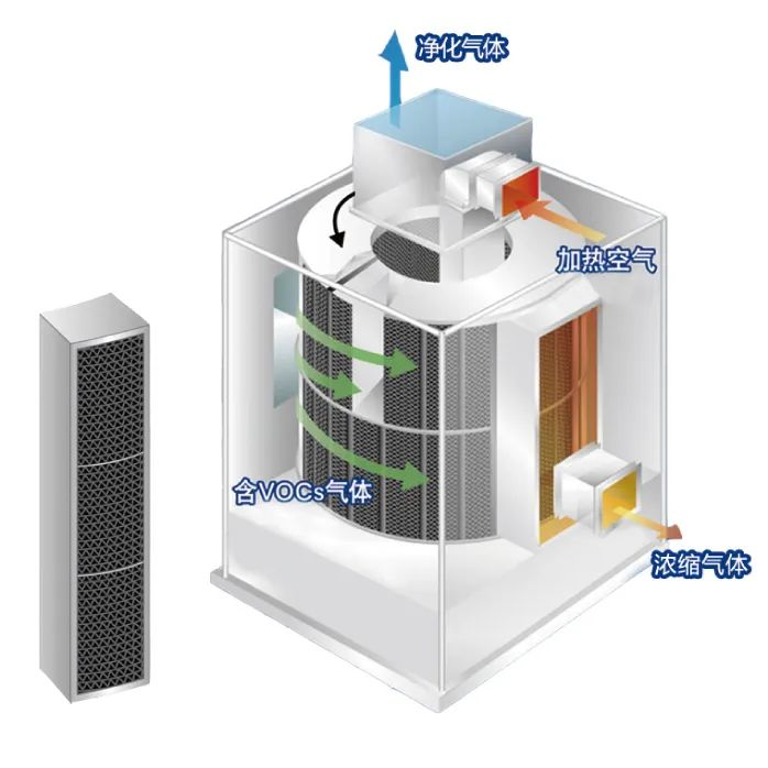 筒式沸石轉(zhuǎn)輪來自日本東洋紡,除了材料加工上的差異,從結(jié)構(gòu)上和盤式有很大的區(qū)別,利用模塊化沸石材料填充成筒狀結(jié)構(gòu),來實現(xiàn)VOCs的吸附濃縮。